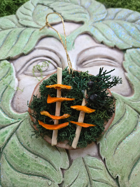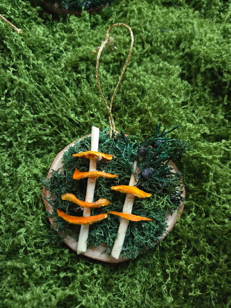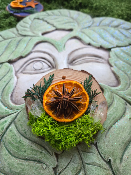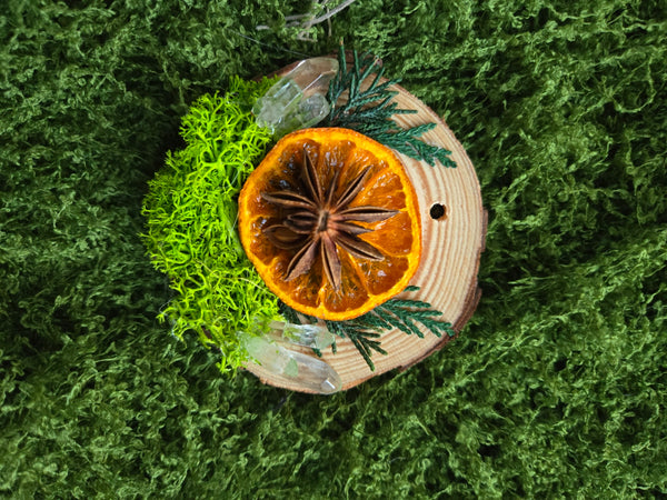 Say hello to your new favorite ornament! This whimsical three-inch wood slice is a tiny woodland wonderland featuring dried orange peel arranged into a dreamy moon, a charming acorn mushroom, soft moss, and sparkly quartz crystals. It's like capturing a magical forest moment and hanging it on your tree. Perfect for nature lovers, crystal enthusiasts, and anyone who thinks ornaments should be as fun and unique as they are.